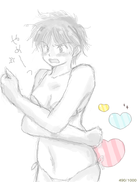 松山でも誰でも無い感じですが(こういう顔しか描けない)、女体になってヒモパン白ビキニ無理やり着せられて照れてるの図。